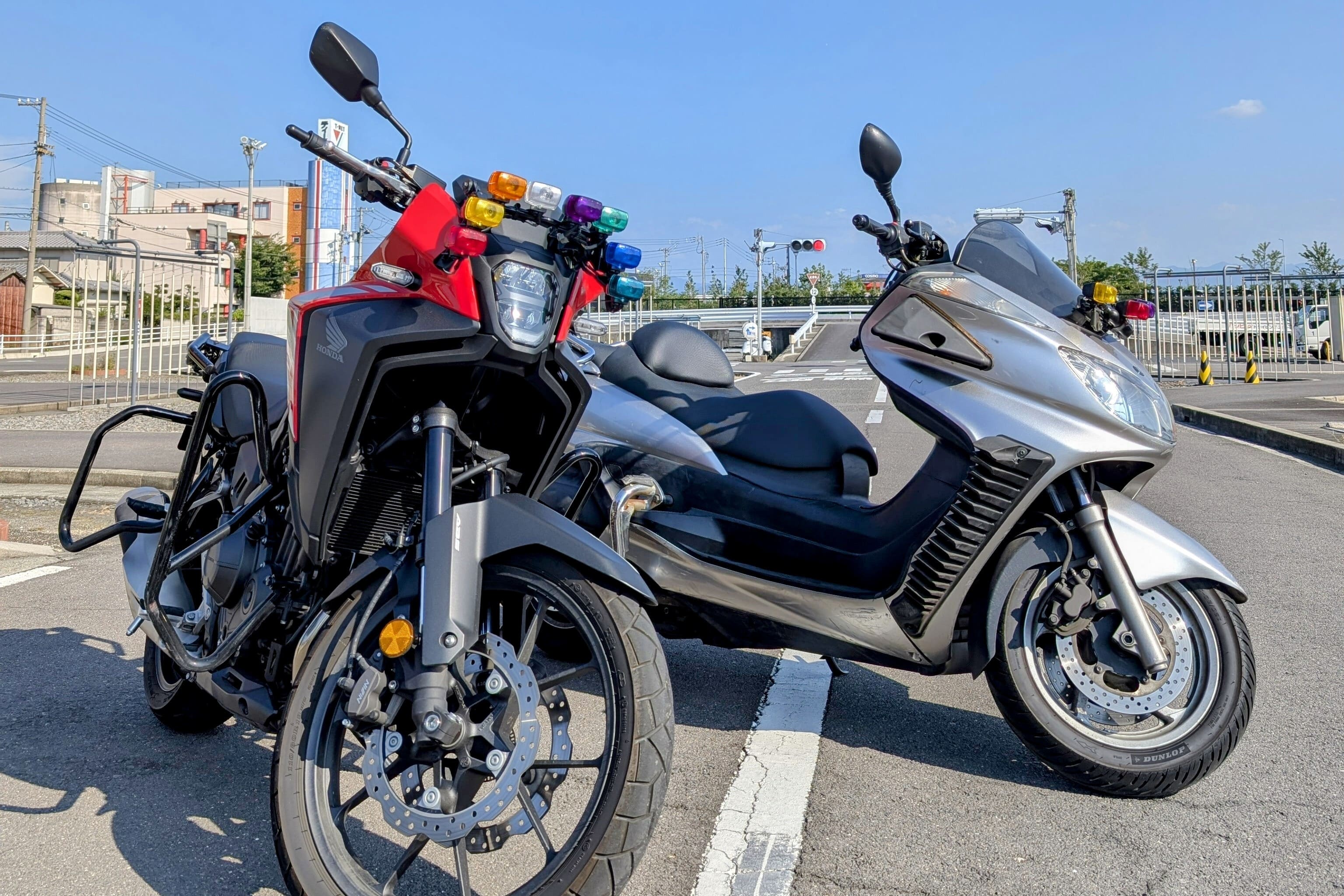 MT車は「ホンダ・NX400L」AT車は「ヤマハ・グランドマジェスティ400」を使用。